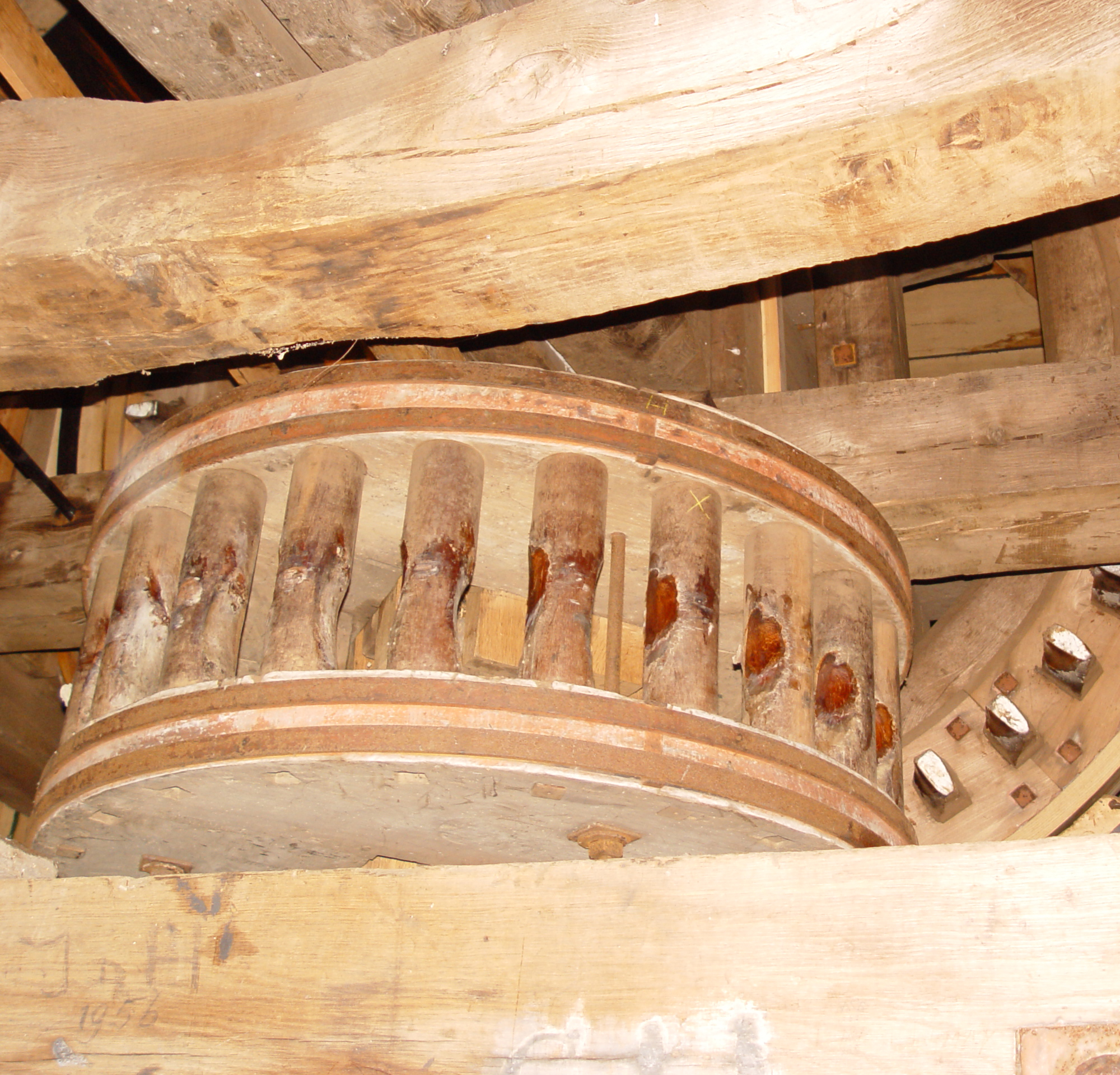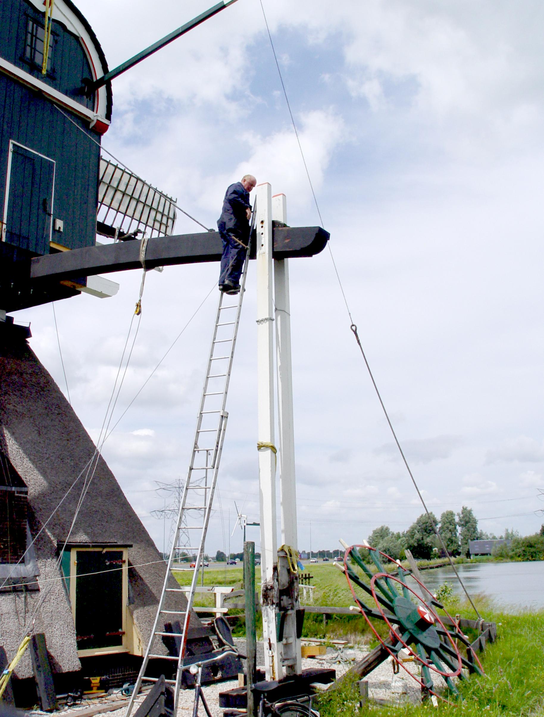 De koker van de molen, waar de koningsspil doorheen gaat, moet opnieuw verticaal worden gesteld.